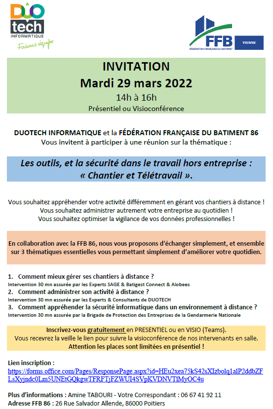INVITATION – Mardi 29 mars 2022 de 14h à 16h en Présentiel ou en Visioconférence. DUOTECH INFORMATIQUE et la FÉDÉRATION FRANÇAISE DU BATIMENT 86 ( Poitiers & Vienne) vous invitent à participer à une réunion sur la thématique : Les outils, et la sécurité dans le travail hors entreprise : « Chantier et Télétravail ».