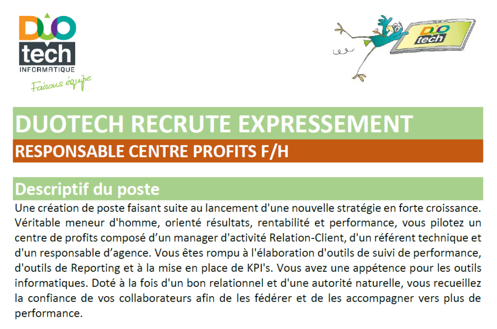 DUOTECH RECRUTE EXPRESSEMENT SON RESPONSABLE CENTRE PROFITS F/H