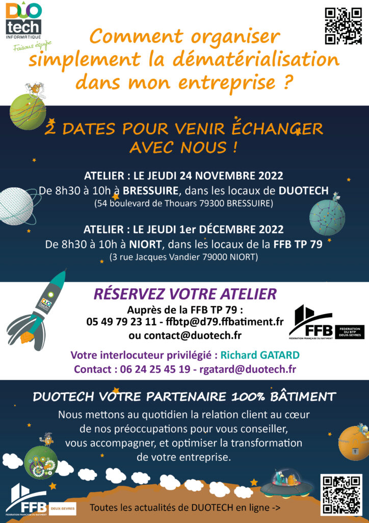 DUOTECH vous propose un évènement en partenariat avec la FFB TP 79. Nous vous proposons 2 dates et 2 lieux pour échanger sur le sujet de la dématérialisation.
