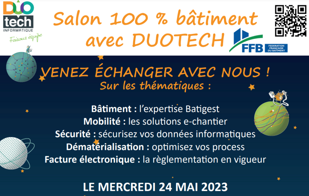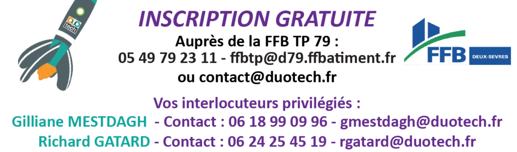 En collaboration avec la FFB 79 & FFB 86, DUOTECH organise le MERCREDI 24 MAI un Salon 100 % dédié aux métiers du bâtiment. Pour connaitre l’ensemble des thématiques à partager ensemble, veuillez téléchargez votre INVITATION GRATUITE en ligne.